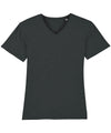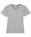 Sæt ærme. selvklæbende stof i halskraven. Indvendig bagkrave i selvvæv. Ærmer og forneden med smal dobbeltsyning. Herre, medium pasform, korte ærmer, v-hals. 100% økologisk ringspundet kæmmet bomuld. Single Jersey. Vasket i stof.