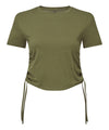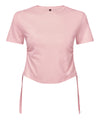 Beskåret t-shirt. Kortærmet. Flæsede detaljer i siderne. Slips. Rund hals. Produktet indeholder ikke et mærkemærke i nakke eller talje. Aftagelig kimble eller beklædningsmærke med løkke. Etiketten i den indvendige søm indeholder vigtig produktinformation på den ene etiket og en anden etiket med mærkeoplysninger, der kan skæres væk.