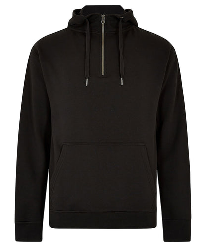 Ytbehandlat tyg i 100% bomull. Självfärgad jerseyfodrad huva. Självfärgad vävd tejp i nacken och på baksidan av dragkedjan för ökad komfort. Tejpade axlar. Manschett med dubbla lager och kant med tvinnålssömmar i hela nålen. Dubbelsydda ärmhål och axlar. Känguruficka. Centralt 1/4-dragkedja med YKK-metall och matchande metallöglor. Platt, enfärgad snodd med metalländar. Avrivbar etikett i nacken för enkel ommärkning. SEDEX- och OEKO-TEX-certifierad.